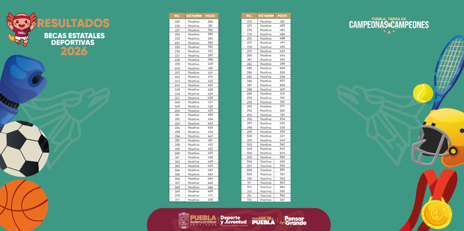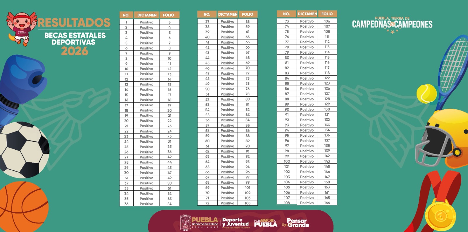 PUEBLA, Pue. - Como parte del apoyo que brinda el gobernador Alejandro Armenta Mier a las y los deportistas poblanos para su desarrollo integral, la Secretaría de Deporte y Juventud da a conocer los resultados de las y los aspirantes a becas deportivas 2026.