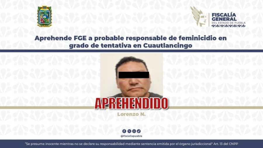Como resultado de actos de investigación, la Fiscalía General del Estado de Puebla (FGE) cumplimentó una orden de aprehensión en contra de Lorenzo N., de 53 años, por su probable responsabilidad en el delito de feminicidio en grado de tentativa, hechos ocurridos en la localidad de Sanctorum, municipio de Cuautlancingo.