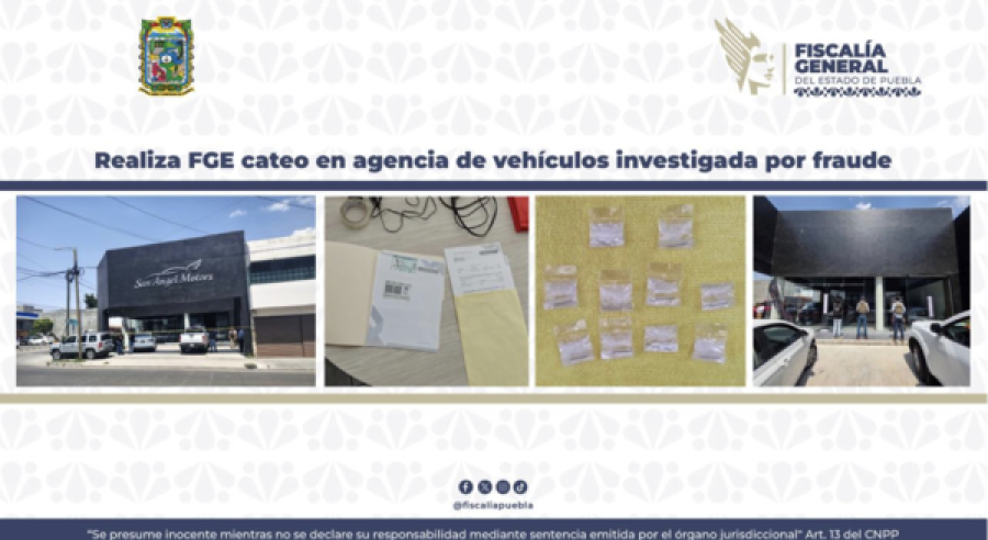 Como parte de una investigación por el delito de fraude, la Fiscalía General del Estado de Puebla (FGE) ejecutó una orden de cateo en un establecimiento denominado “San Ángel Motors”, ubicado en la colonia Prados Agua Azul, del municipio de Puebla.